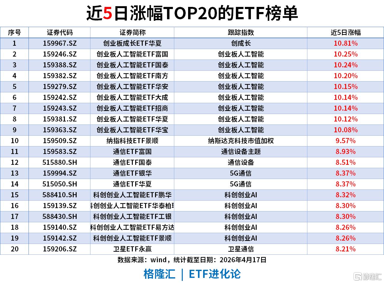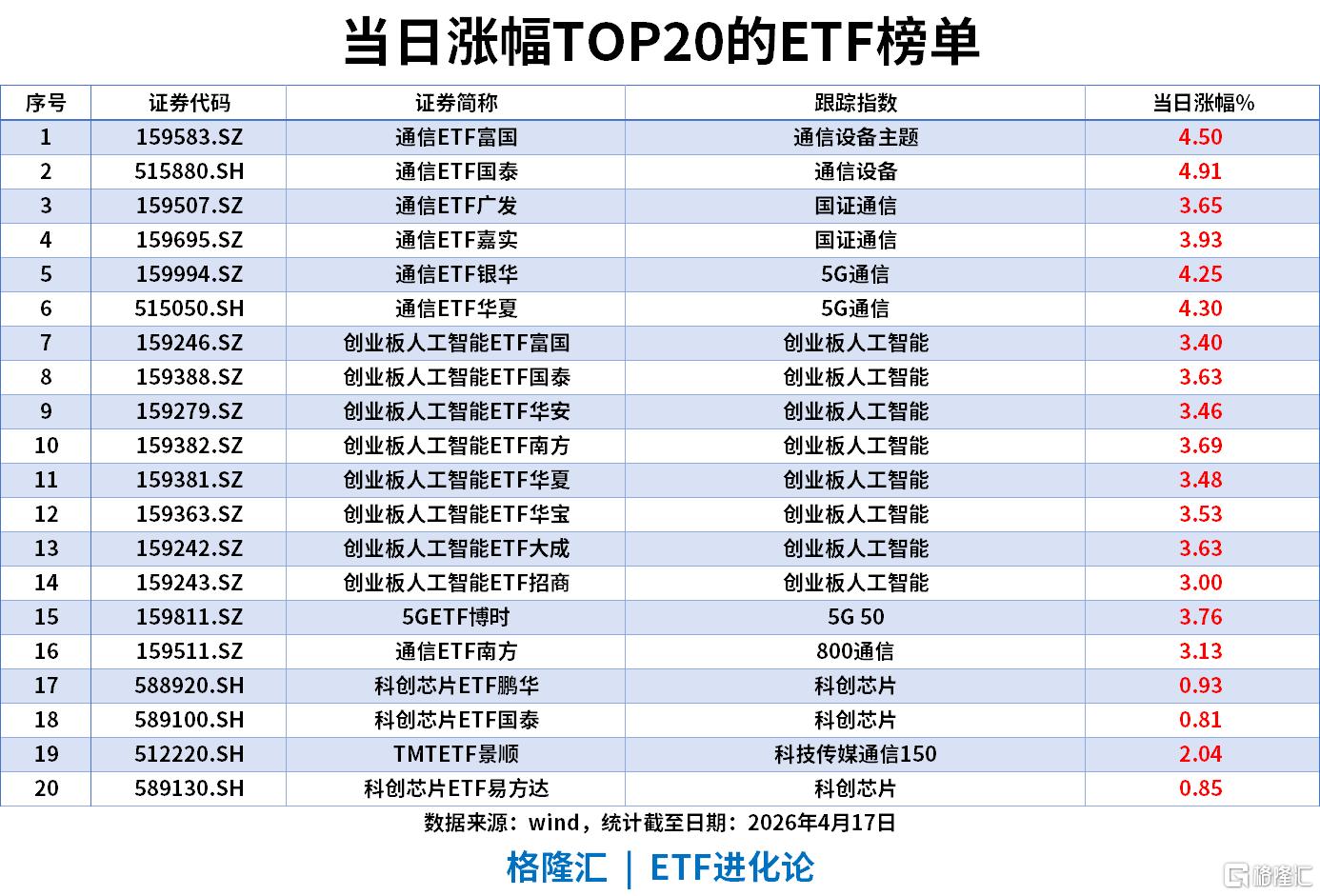 通信板块迎来全线爆发,通信设备主题、通信设备、国证通信、5G通信等通信行业主题ETF包揽榜单前6席,其中通信ETF国泰以4.91%领涨全市场,创业板人工智能ETF同步走强,涨幅均超3%。