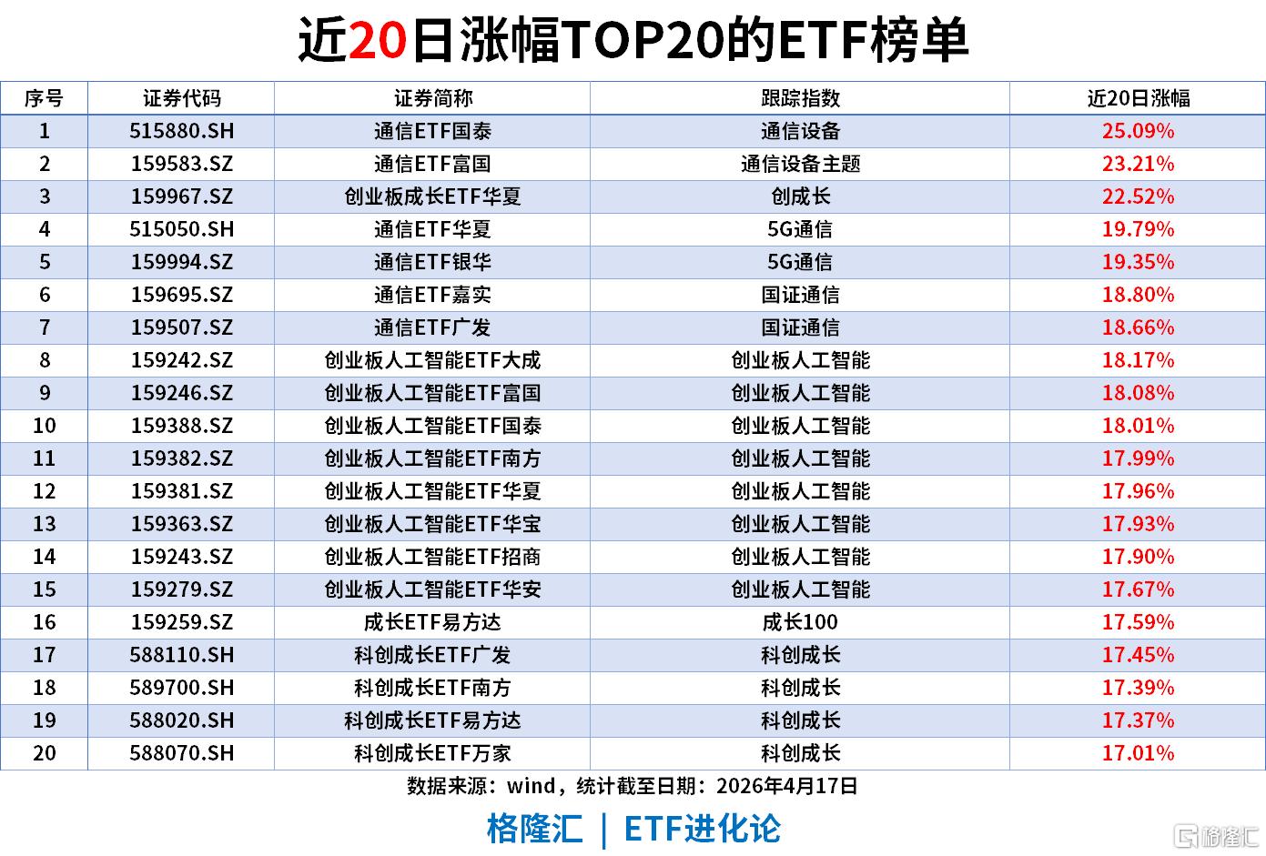 通信板块持续领跑,近20个交易日,通信设备ETF国泰以25.09%居首,通信ETF富国、创业板成长ETF华夏涨超22%,通信ETF华夏涨超19%,市场中期风格完全聚焦高景气科技成长赛道。