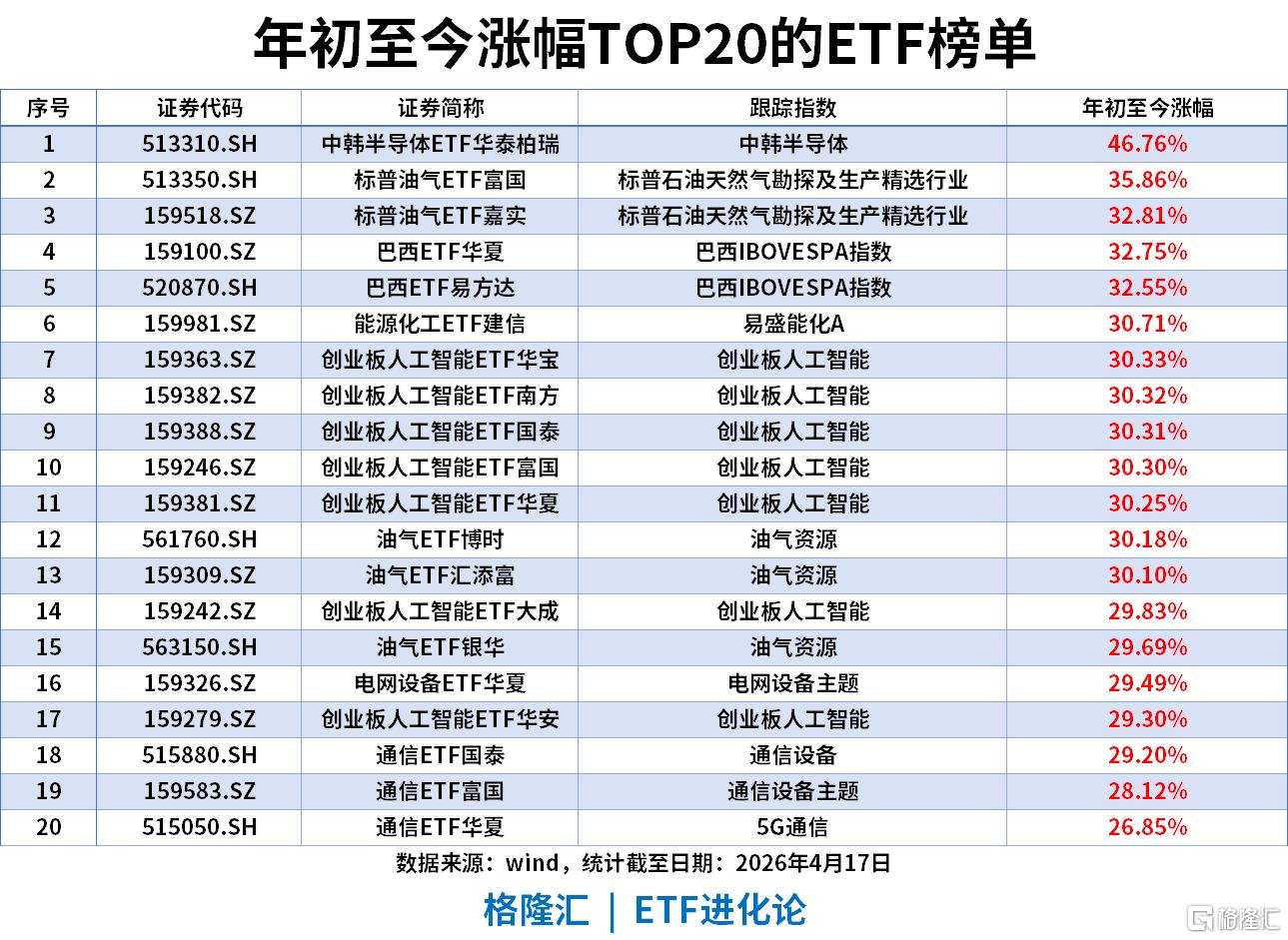 年度主线格局清晰稳固,中韩半导体ETF以46.76%的涨幅登顶年度最强ETF。标普油气相关ETF紧随其后,标普油气ETF富国、嘉实分别以35.86%、32.81%的涨幅位列第二、三位,巴西ETF华夏、巴西ETF易方达和能源化工ETF建信年内涨超30%,能源资源主线贯穿全年。创业板人工智能ETF华宝、创业板人工智能ETF南方、创业板人工智能ETF国泰年内同样上涨30%。