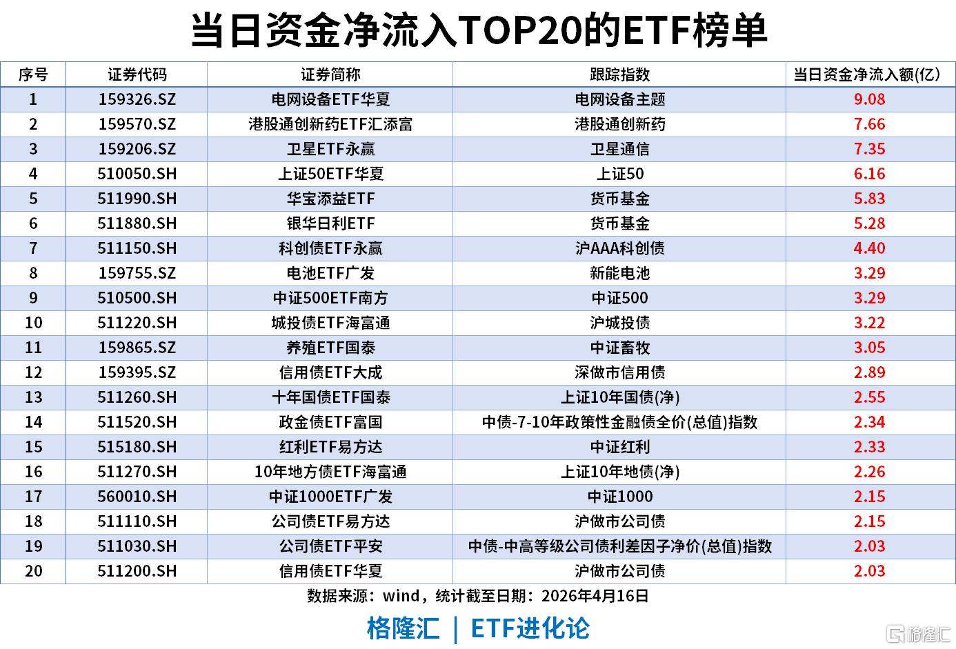 当日资金呈现成长赛道与固收工具并行的格局,电网设备ETF华夏以9.08亿净流入领跑,港股通创新药ETF汇添富、卫星ETF永赢分别以7.66亿、7.35亿位列第二、三位,上证50ETF华夏、华宝添益ETF、银华日利ETF单日流入超5亿元。