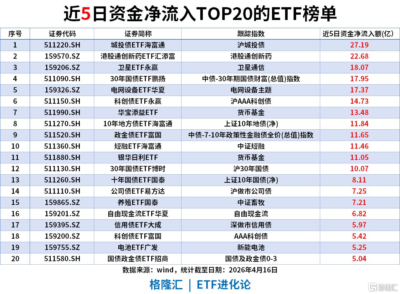 中期资金固收与成长双主线驱动,城投债ETF海富通以27.19亿净流入大幅领跑,港股通创新药ETF汇添富以22.68亿净流入位列第二,卫星ETF永赢、电网设备ETF华夏分别以18.07亿、17.37亿紧随其后。