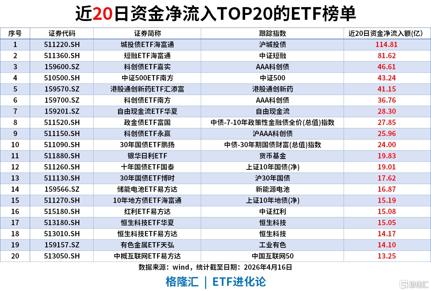 中长期资金形成固收防御、宽基与成长均衡配置的清晰格局:城投债ETF海富通以114.81亿净流入登顶,中证500ETF南方以43.24亿净流入位列第四。