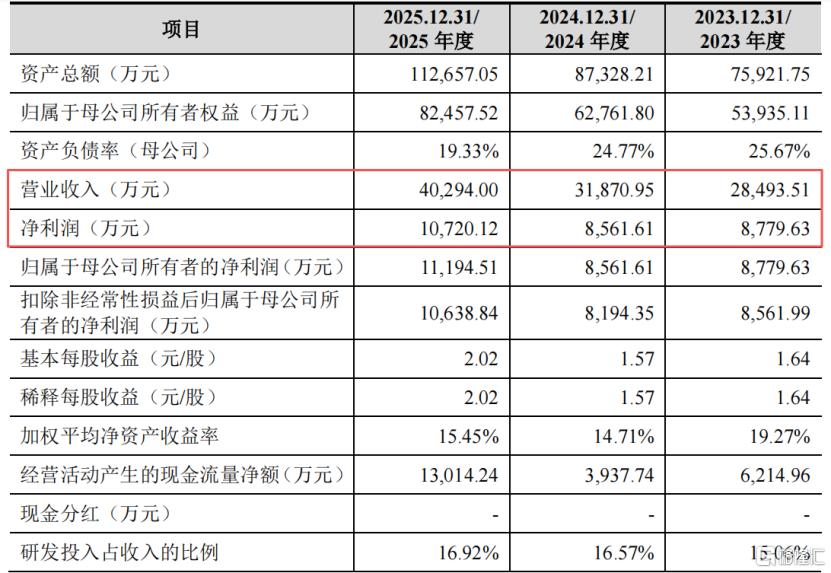 2023年、2024年及2025年(报告期),公司营业收入分别为2.85亿元、3.19亿元和4.03亿元,归属于母公司股东的净利润分别为8779.63万元、8561.61万元和1.12亿元。
