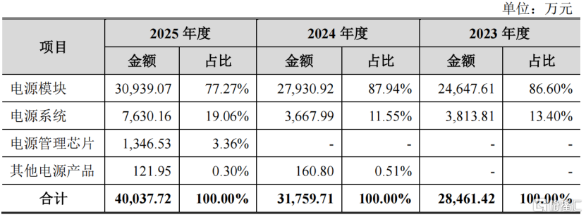 从产品收入构成来看,2025年,电源模块产品占收入的比重为77.27%,较2024年有所下降;电源系统的收入占比则较2024年有所提升。