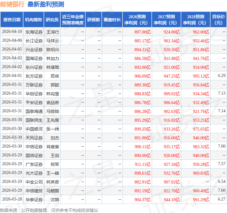 太平洋证券股份有限公司夏芈卬,王子钦近期对邮储银行进行研究并发布了研究报告《邮储银行2025年年报点评:非息驱动增长,拨备反哺利润》,给予邮储银行买入评级。