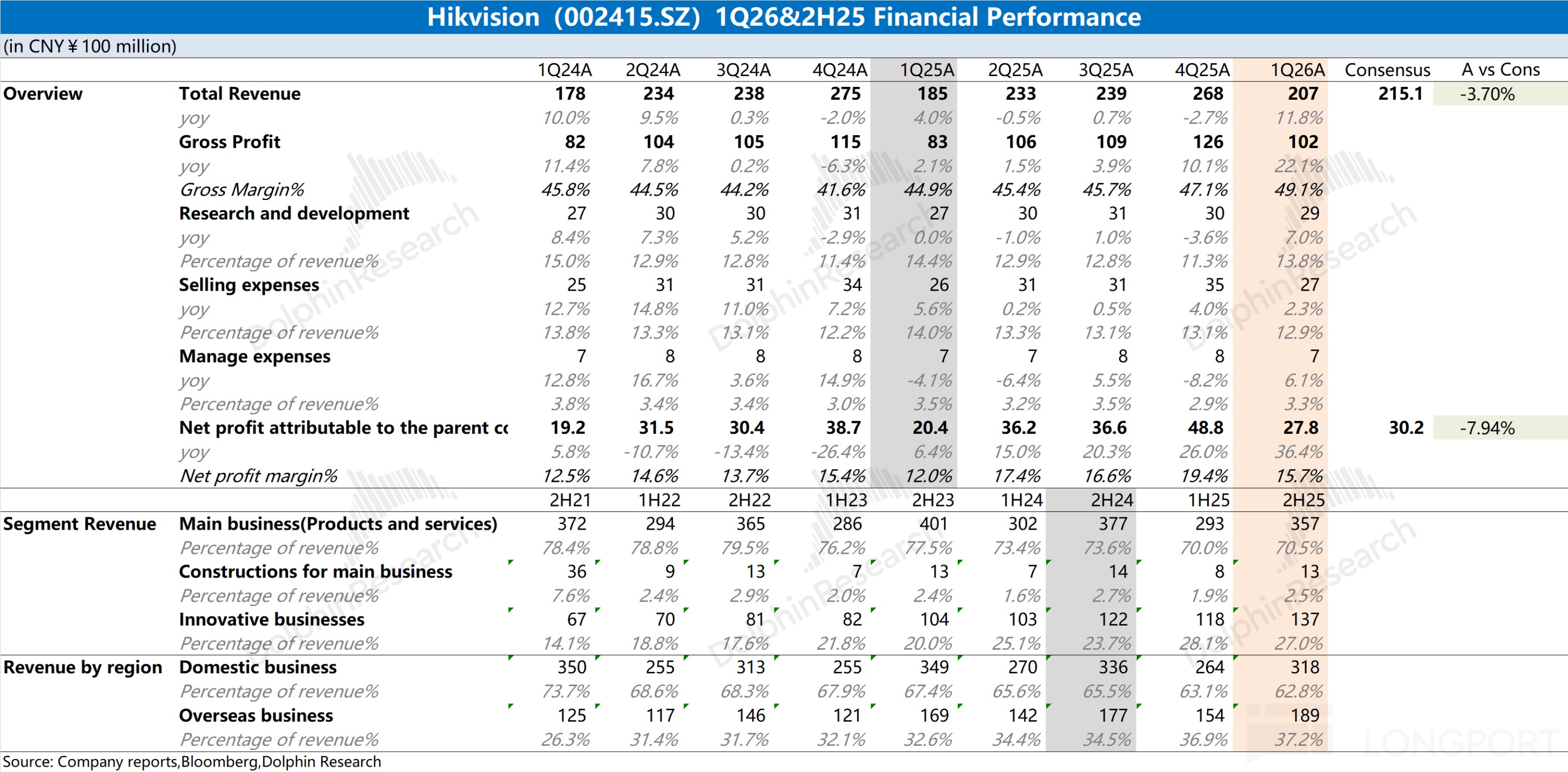 一、整体业绩:产品涨价,带动双位数增长。海康威视在 2026 年第一季度实现营收 207 亿元,同比增长 11.8%。营收能重回两位数增长,主要是公司在本季度对产品进行了统一涨价;2026 年第一季度实现归母净利 28 亿元,净利率回升至 15.7%。业绩回升,主要是公司产品涨价后营收和毛利率都有增长,本季度毛利率提升到了 49.1%。
