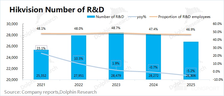 在经营面承压的情况下,公司进行了裁员、降费等操作。在 2025 年公司员工总数裁减了 2479 人,近十年来首次减少。至 2025 年末,研发人员下降至 2.68 万人,年内裁减了 1466 人。