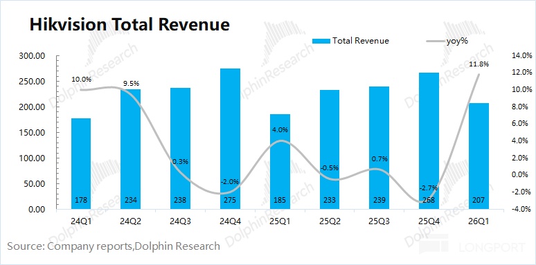 海康威视在 2026 年第一季度实现营收 207 亿元,同比上升 12%。公司营收重回两位数增长,主要是因为公司在本季度对全系产品进行了统一涨价。
