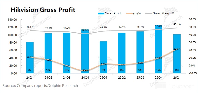 海康威视在 2026 年第一季度实现毛利 102 亿元,同比增长 22%。其中公司本季度毛利率为 49.1%,同比提升 4.2pct。