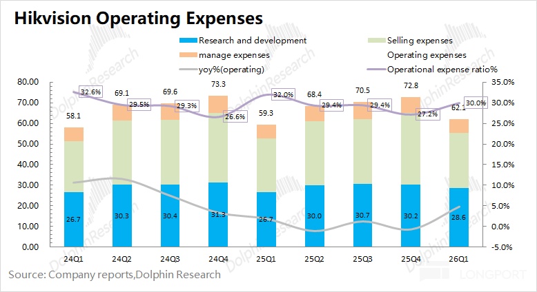 海康威视的核心费用情况主要有销售费用、管理费用和研发费用。海康威视 2026 年第一季度三项核心费用合计 62 亿元,同比增长 5%。三项核心费用率为 30%,同比下滑 2pct。