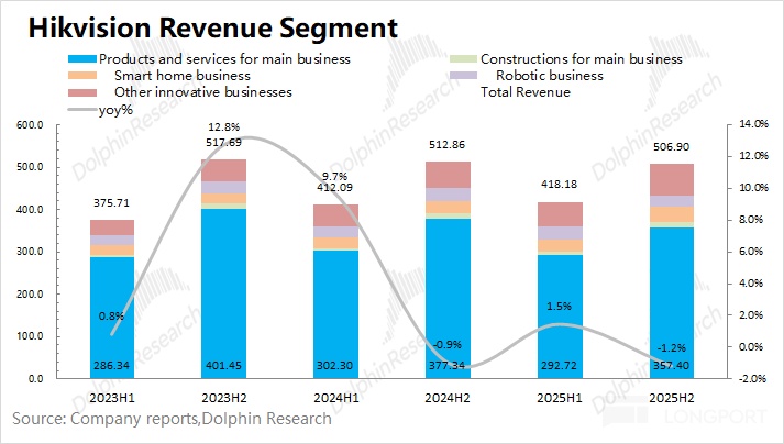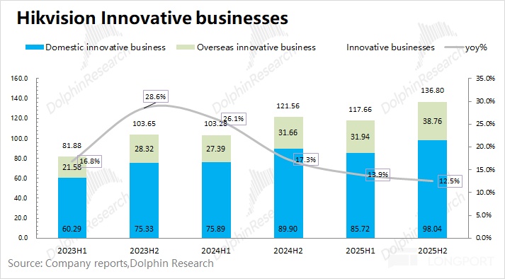 ①在境内的创新业务中,海康威视 2025 年下半年实现营收 98 亿元,同比增长 9%,增速跌落至个位数。从营收体量看,创新业务目前依然主要集中在境内业务。