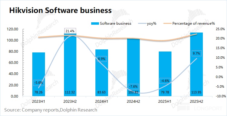 海豚君通过估算 2025 年下半年海康威视的软件端业务收入为 114 亿元,同比增长 10%。海康威视软件附加值,在公司总收入的比重回升至 22% 附近。