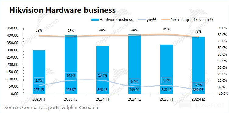 在测算出软件附加值后,通过公司年度总收入,可以得到海康威视的硬件端收入。2025 年下半年海康威视的硬件端业务收入为 393 亿元,同比下滑 4%。