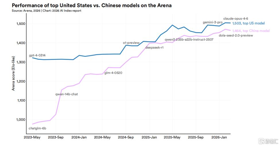 据斯坦福大学2026年度AI指数报告,截至今年3月,中美AI差距只剩2.7%。