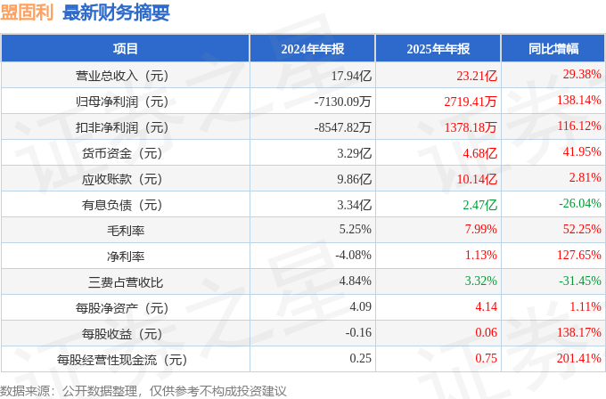 据证券之星公开数据整理,近期盟固利(301487)发布2025年年报。截至本报告期末,公司营业总收入23.21亿元,同比上升29.38%,归母净利润2719.41万元,同比上升138.14%。按单季度数据看,第四季度营业总收入6.91亿元,同比上升43.42%,第四季度归母净利润1910.35万元,同比上升123.78%。本报告期盟固利盈利能力上升,毛利率同比增幅52.95%,净利率同比增幅127.51%。