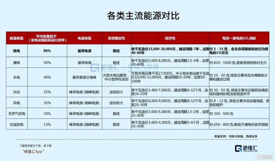 先看长逻辑。核电是目前唯一能同时满足"大规模、全天候、低成本、零碳排放"四个条件的能源。它的容量因子高达90%以上,也就是说,一年365天有超过328天能满功率运行。相比之下,光伏的容量因子只有25%,风电只有35%。