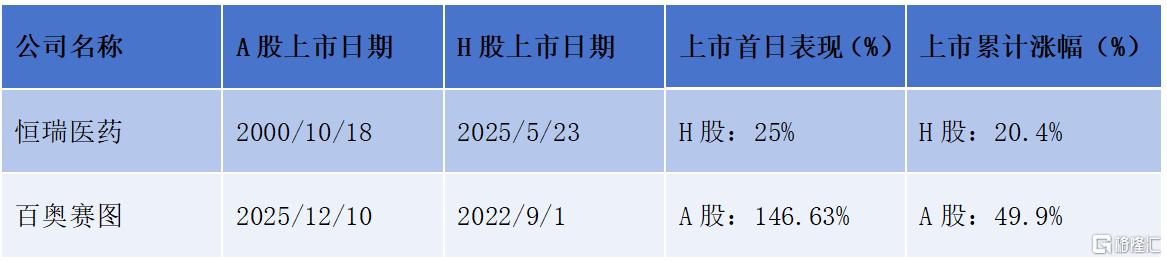 从过往A+H药企的市场表现来看,这条路径后续发展值得期待。2025年,共有两家创新药企成功实现A+H双平台上市,无论是上市首日还是后续累计涨幅,均录得不错表现。