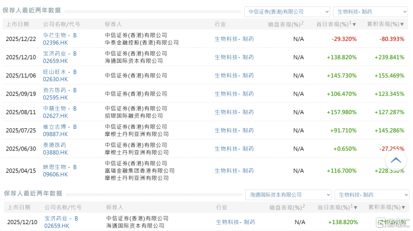 从保荐机构的资质来看,迈威生物的联席保荐人过往战绩不俗。据公开数据,中信证券在过去一年中,共保荐8家生物制药领域企业赴港上市,其中上市首日录得正收益的比例高达87.5%,首日平均涨幅达91.1%,累计平均涨幅更是达到114%,整体表现亮眼。