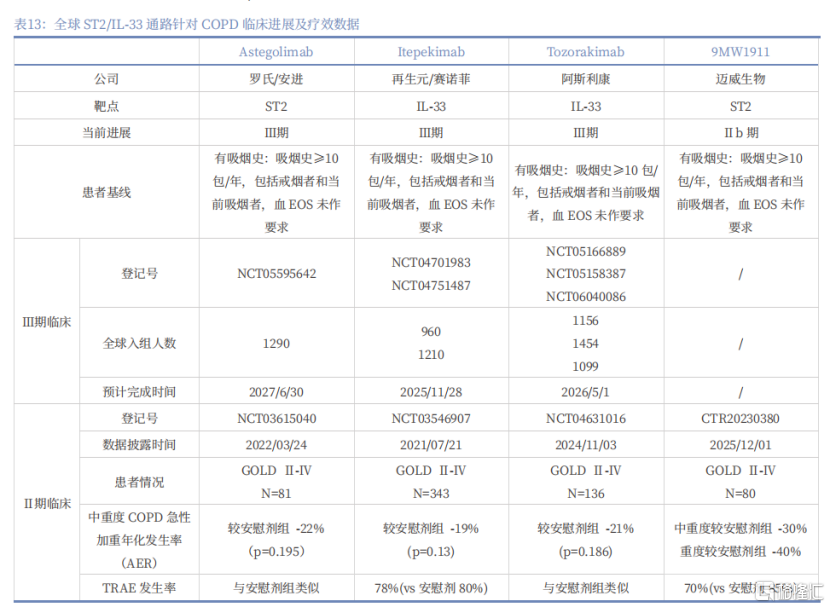 中国COPD患者数量超1亿,其中中重度患者约4000万,是全球第三大死亡因素,但该领域长期缺乏有效的生物制剂。目前唯一获批的COPD生物制剂度普利尤单抗仅适用于血EOS升高的2型炎症亚群,该亚群约占COPD患者的20%-40%,这意味着超过60%的COPD患者目前仍无有效的生物制剂可选。赛诺菲、罗氏的同靶点竞品均在III期临床中折戟,体现出研发的难度,但阿斯利康的针对同一通路的IL-33单抗 III期临床达到主要终点,验证了该通路的可成药性。