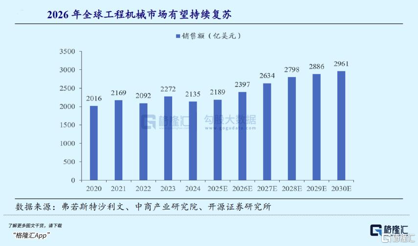 海外市场成为工程机械增长的第二曲线,全球行业周期回暖+国产品牌竞争力跃升,出口持续超预期。全球工程机械市场稳步复苏,2026年市场规模有望突破2300亿美元。