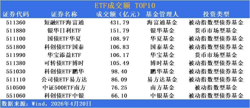 短融ETF海富通(511360)单日成交超431亿元稳居成交榜榜首,作为短久期信用债工具持续担当资金管理利器,受益于市场资金面宽松背景下的现金管理需求升温。