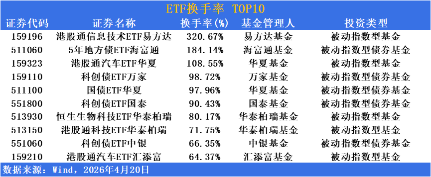 从换手率维度观察,港股科技板块交投博弈激烈,港股通信息技术ETF易方达(159196)以高达320.67%的换手率遥遥领先,高居当日换手率榜首。5年地方债ETF海富通(511060)换手率超184%,科创债ETF万家(159110)换手率超98%,国债ETF华夏(511100)换手率超97%,科创债ETF国泰(551800)换手率超90%,科创债ETF中银(551060)换手率超66%,债券型产品同样热度高企,进一步印证股债两市资金对高流动性工具的追逐,以及债牛行情下交易型资金的积极参与。