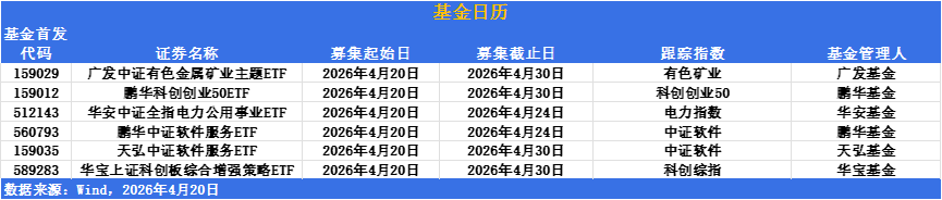 ETF发行市场方面,6只产品明日集中开募,覆盖有色矿业、科创创业、电力公用事业及软件服务等多个赛道