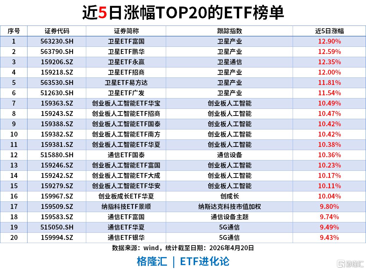 卫星通信与创业板人工智能形成双主线共振领涨格局,科技成长赛道全面占优。卫星ETF富国以12.90%领跑,创业板人工智能ETF以10%涨幅紧随其后。