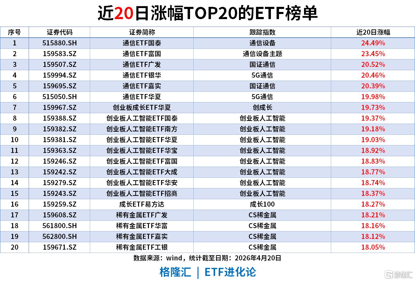 通信板块持续领跑,人工智能与稀有金属赛道同步共振,科技成长主线贯穿中期行情。通信设备ETF国泰以24.49%居首。创业板人工智能相关ETF包揽榜单多数席位,整体涨幅超18%;稀有金属ETF亦录得18%的涨幅,三大赛道形成共振上涨格局。