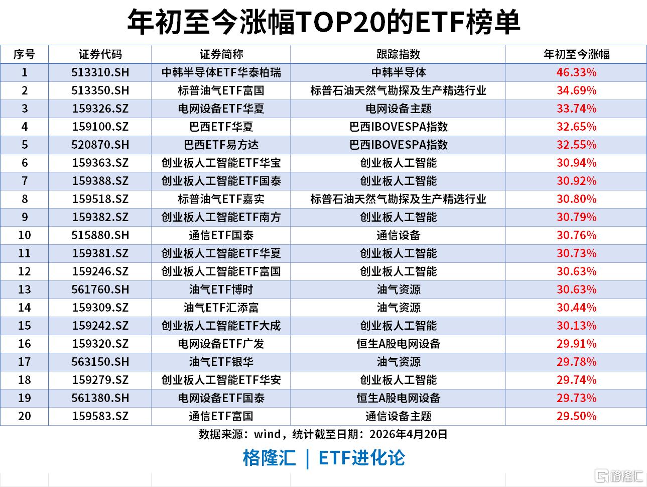 年度主线格局清晰稳固,中韩半导体ETF以46.33%的涨幅登顶年度最强ETF。标普油气相关ETF紧随其后,标普油气ETF富国、嘉实分别以34.69%、30.80%的涨幅位列第二、八位。电网设备、创业板人工智能、通信设备等赛道亦进入年度榜单前列,其中电网设备ETF华夏以33.74%位列第三,创业板人工智能ETF华宝、创业板人工智能ETF国泰年内涨30%,科技成长与能源赛道形成年度双主线格局。
