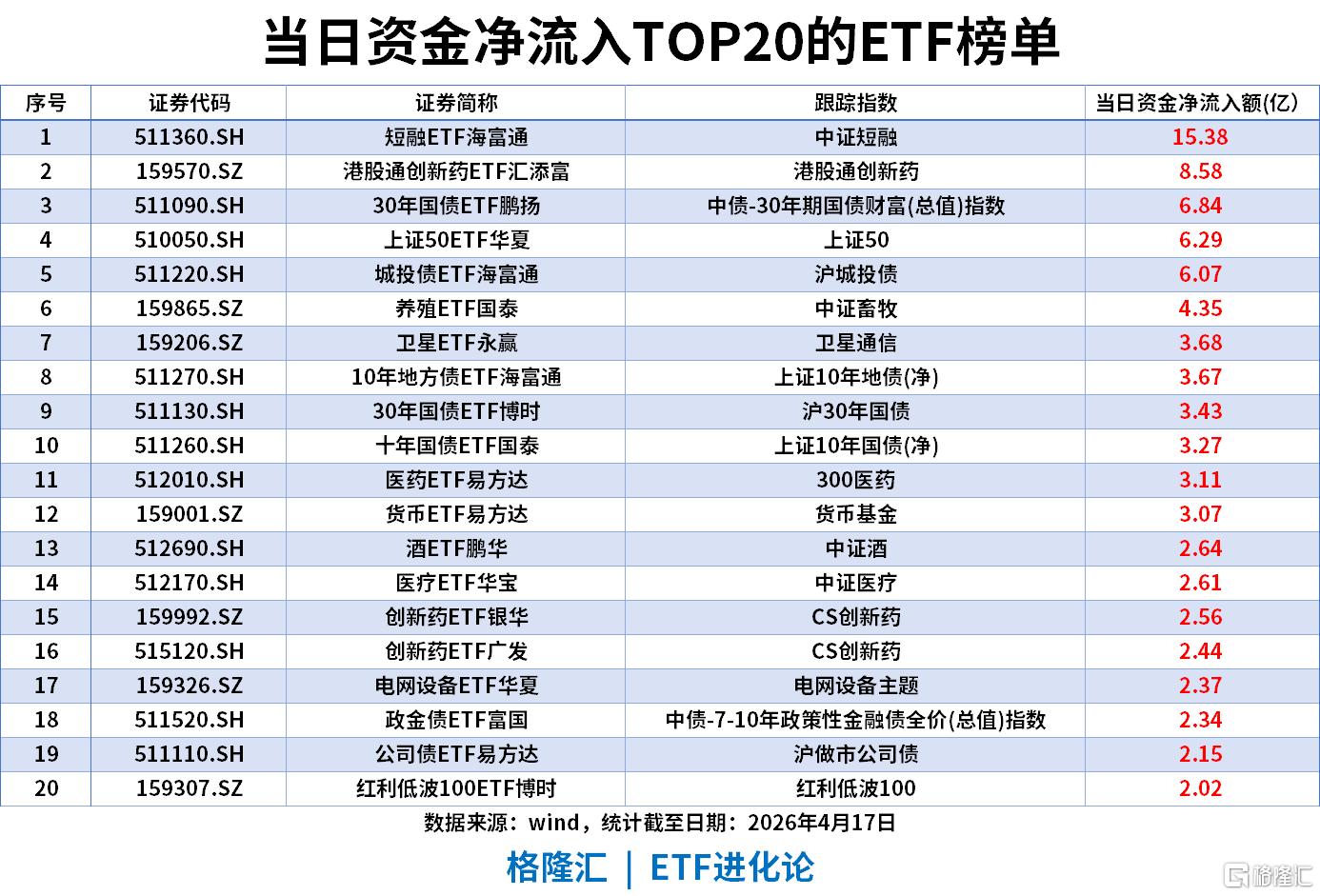 短融ETF海富通以15.38亿净流入领跑,港股通创新药ETF汇添富以8.58亿净流入位列第二,医药ETF易方达、创新药ETF银华、创新药ETF广发等合计流入超10亿,医药板块成为当日最受资金追捧的成长方向。