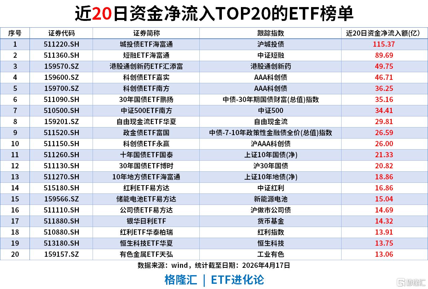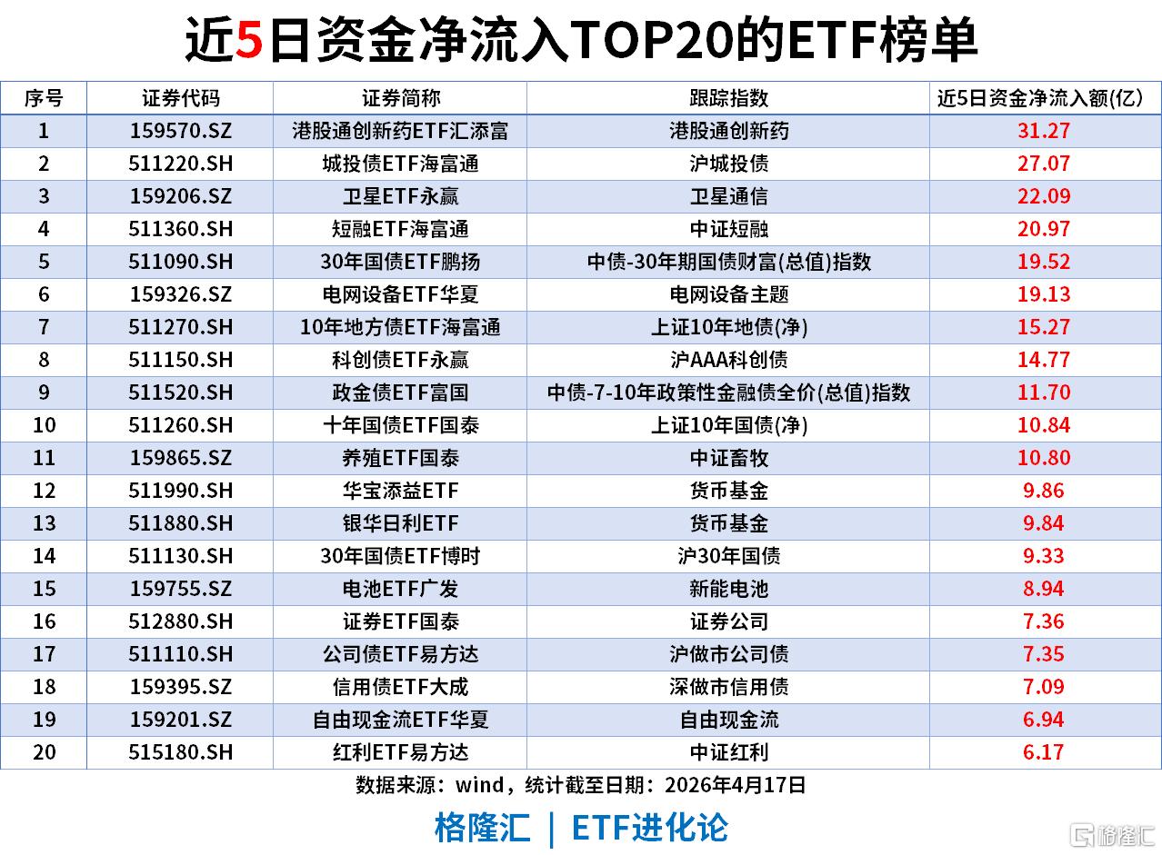 中期资金医药与固收双主线驱动,高景气成长赛道持续获加仓:港股通创新药ETF汇添富以31.27亿净流入大幅领跑,卫星ETF永赢、电网设备ETF华夏分别获资金净流入22亿元、19亿元。