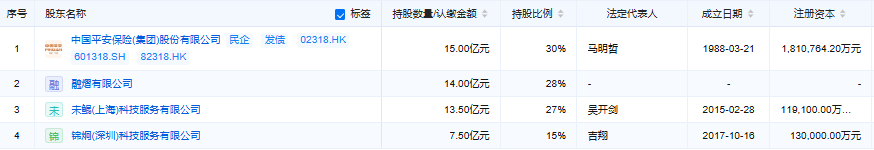 平安消费金融是保险系首家持牌消费金融公司,于2020年4月在上海正式成立,注册资本50亿元。据企业预警通显示,公司股权结构为中国平安集团出资15亿元持股30%为第一大股东,其余三家股东融熠、未鲲、锦炯分别持股28%、27%、15%,背靠平安生态资源,自成立以来业务扩张速度迅猛。