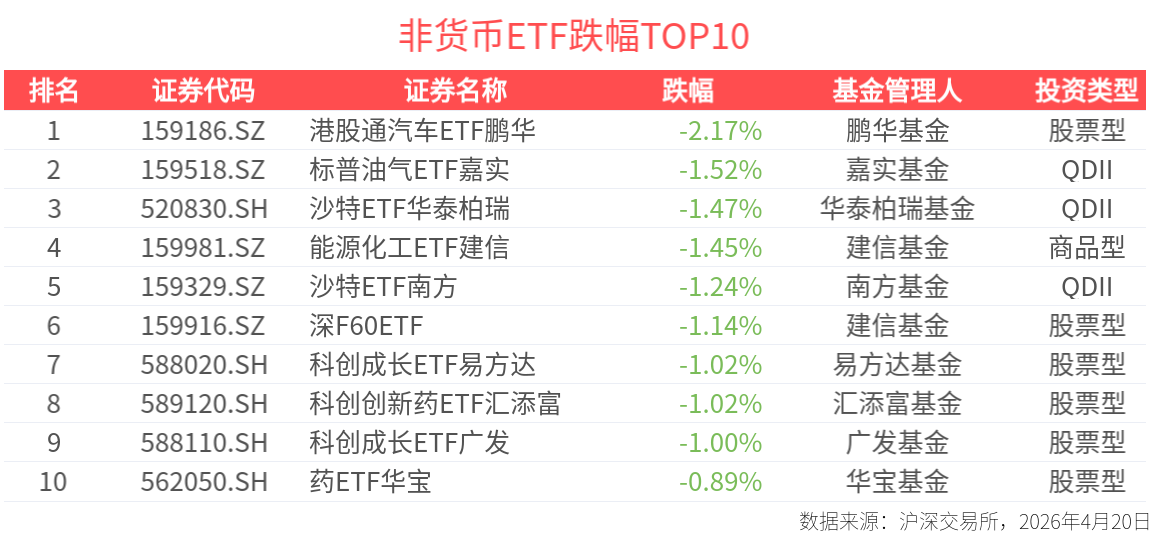 截至今日收盘,全市场共计281只非货ETF下跌,下跌比例达19%。行业主题指数方面,中证制药指数、上证科创板创新药指数跌幅居前,分别下跌1.04%、1.02%。