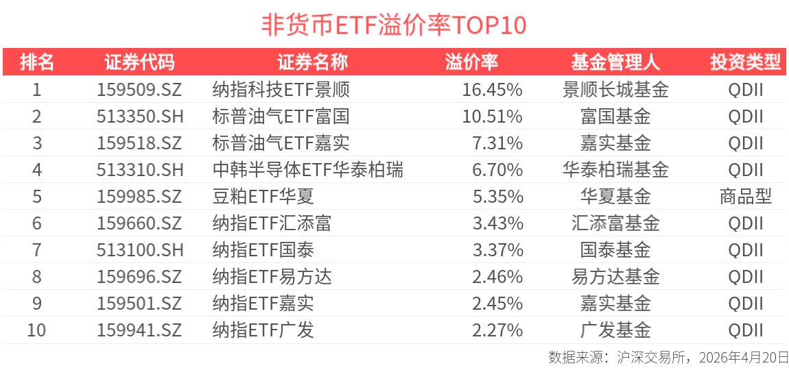 截至今日收盘,纳斯达克科技市值加权指数溢价居前,纳指科技ETF景顺收盘溢价16.45%;标普石油与天然气的勘探与生产精选行业指数情绪高涨,标普油气ETF富国、标普油气ETF嘉实,分别收盘溢价10.51%、7.31%。
