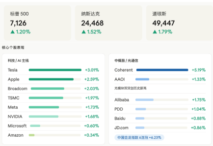 上周美股在中东局势缓和与AI主线共振下强势收涨,三大指数全线创历史新高,纳指实现13连涨、标普本月累涨约9%,科技、光通信、中概股全面修复;然而周末伊朗突然否认谈判进展并重新关闭霍尔木兹海峡,市场或将在本周一面临上周涨幅的回调压力。