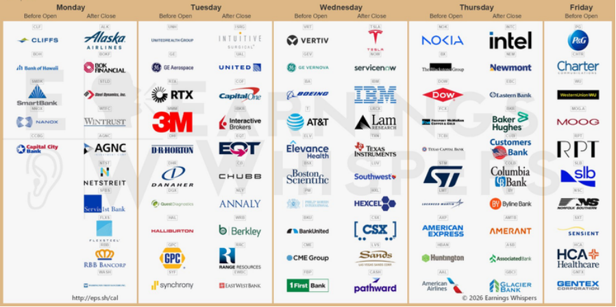 本周进入密集财报窗口,Tesla与Intel将先后披露业绩,叠加IBM、GE Vernova、Vertiv等算力链公司集中发布,市场将重点验证AI资本开支与盈利兑现情况。若业绩与指引继续强化增长叙事,指数仍有上行动力;反之需警惕高位波动与估值回调压力。