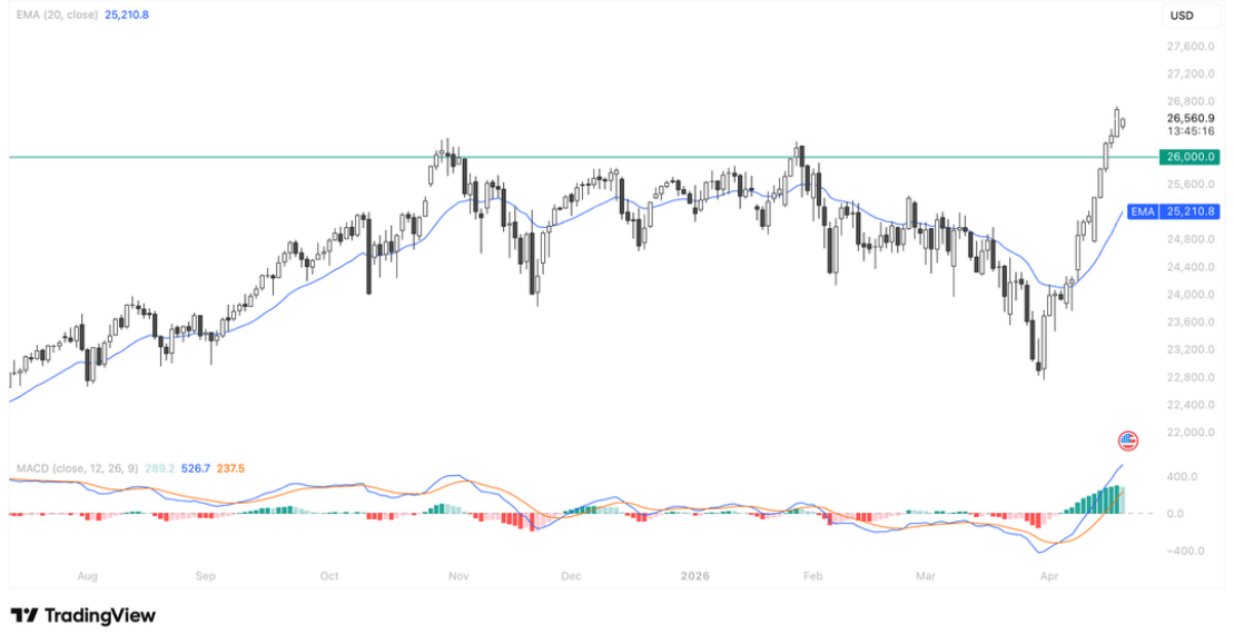 本轮纳指100突破26,000并非单一事件驱动——地缘缓和只是催化剂,真正的底层逻辑是AI算力需求持续超预期叠加流动性宽松预期共同构筑的双引擎行情。从图形看,MACD动能为近一年最强,EMA20已被大幅甩开并开始向上弯曲,趋势结构健康。即便伊朗变局引发短期情绪扰动,也难以撼动AI资本开支加速、芯片供应链景气向上的主线逻辑。26,000一旦回踩确认支撑,反而是更好的介入窗口。