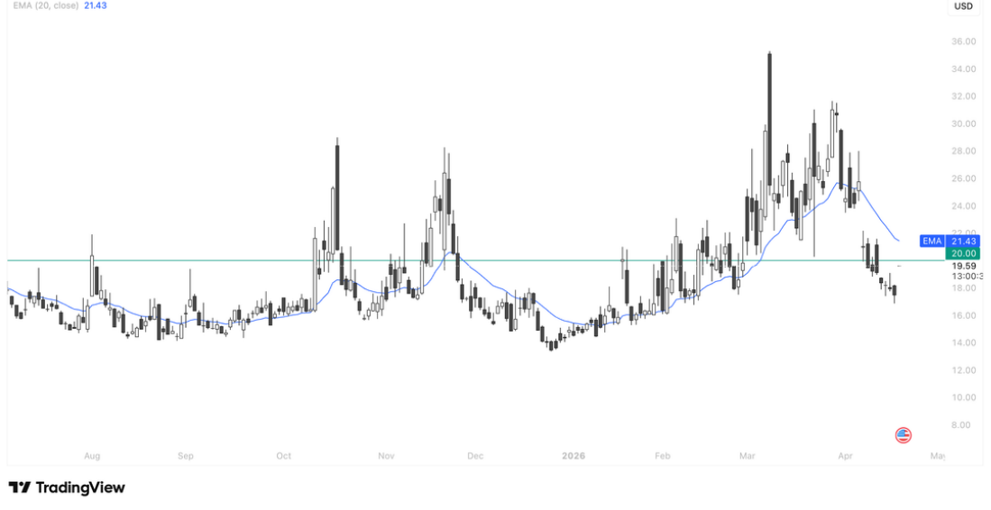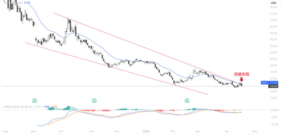 $FIG当前技术面处于明确的长期下降通道中,近期尝试突破通道上轨与20日EMA宣告失败,股价回落至$18.92,短期均线压力明确,叠加基本面利空带来的抛压,整体弱势格局未改,若无法放量收复$21并配合 MACD 金叉确认反弹,大概率进一步回调,打开新的下跌空间。