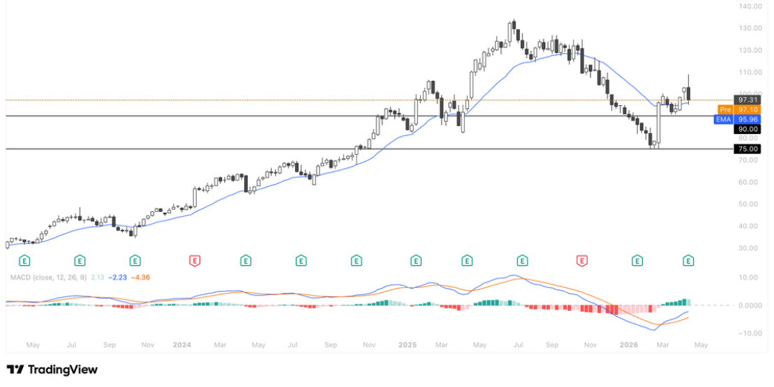 该股在财报后收出大阴线,技术面完成了对前期上涨趋势的深度回调,短期反弹动能初现;但从趋势结构看,前期高点回落的压力仍在,$75-$90 区间作为前高突破后的回踩确认区,兼具支撑有效性与风险收益比优势,是更具吸引力的低吸布局位置,需等待价格回踩确认支撑并配合成交量企稳信号,再把握趋势反转后的进场机会 。