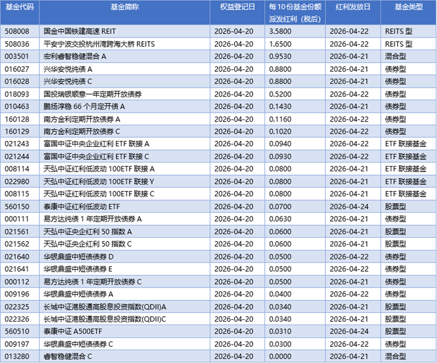 四、04月20日基金分红一览