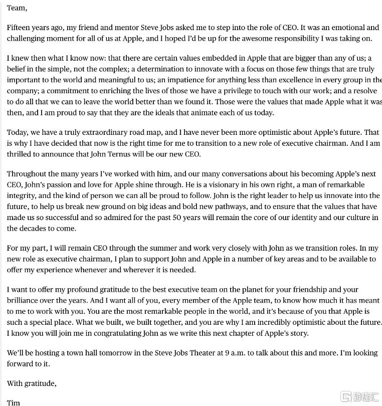 这是自2011年库克接替史蒂夫·乔布斯执掌苹果以来,苹果首次进行首席执行官交接。库克是在乔布斯去世前不久接任的。在库克的领导下,苹果市值增长了约24倍,周一收盘时达到4万亿美元。