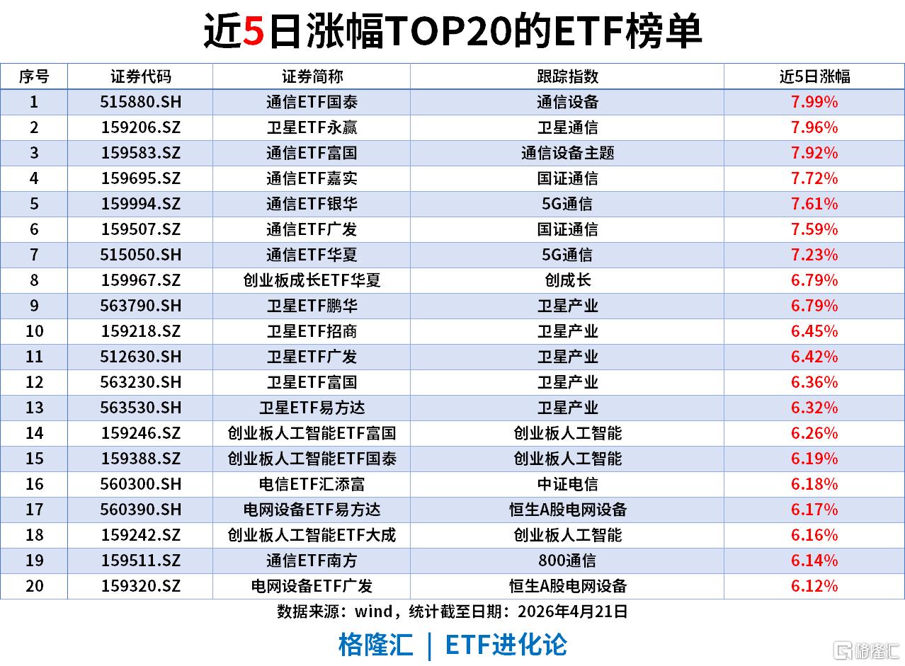 通信与卫星通信板块形成双主线共振领涨格局,科技成长赛道全面占优。通信设备、国证通信、5G通信等通信行业主题ETF包揽榜单前7席,通信ETF国泰以7.99%领跑。