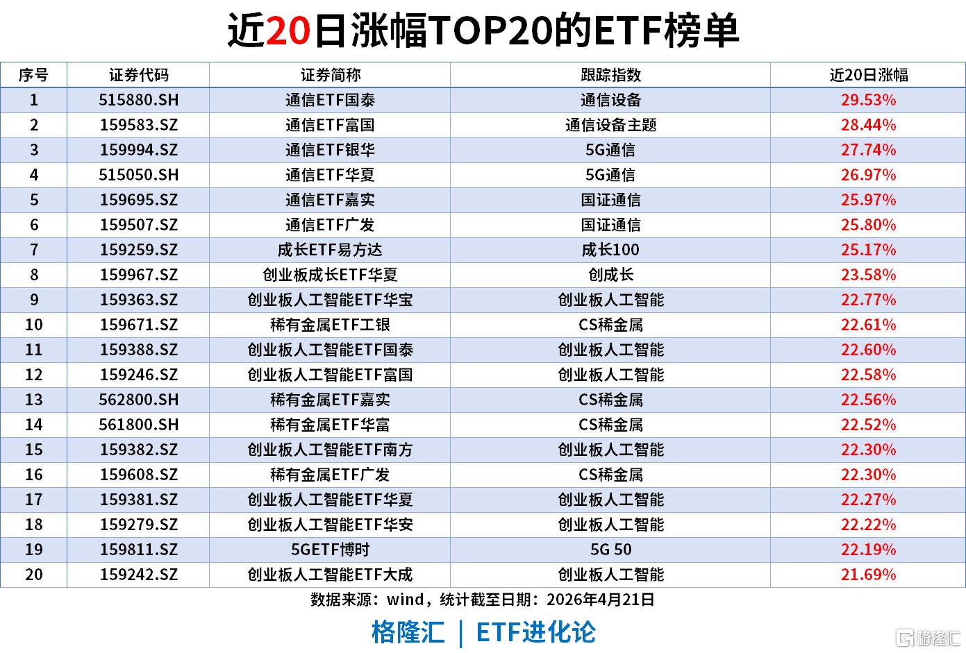 通信板块持续领跑,人工智能与稀有金属赛道同步共振,科技成长主线贯穿中期行情。通信设备ETF国泰以29.53%居首,创业板人工智能ETF涨超21%;