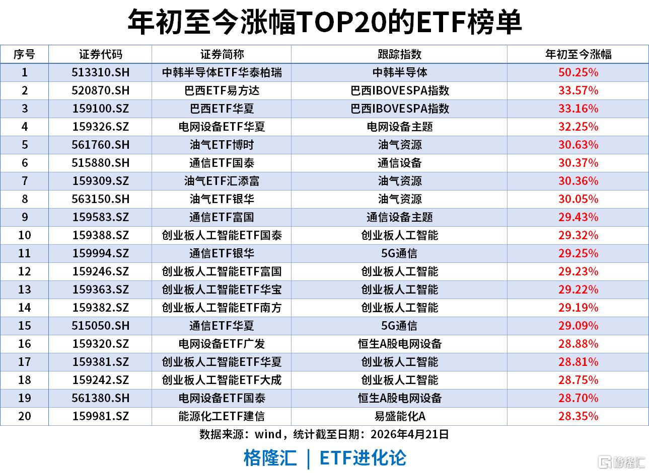 年度主线格局清晰稳固,中韩半导体ETF华泰柏瑞以50.25%的涨幅登顶年度最强ETF,成为成长赛道绝对龙头。巴西ETF易方达、巴西ETF华夏分别以33.57%、33.16%位列第二、三位。,通信设备ETF国泰涨幅超29%,电网设备ETF华夏以32.25%位列第四,油气资源相关ETF涨幅超30%,科技成长、能源资源与海外市场形成年度多主线格局。