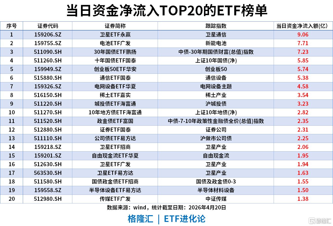 卫星ETF永赢以9.06亿净流入领跑,电池ETF广发以7.71亿紧随其后,电网设备、通信、稀土等赛道同步获3-5亿资金流入,科技成长主线清晰。