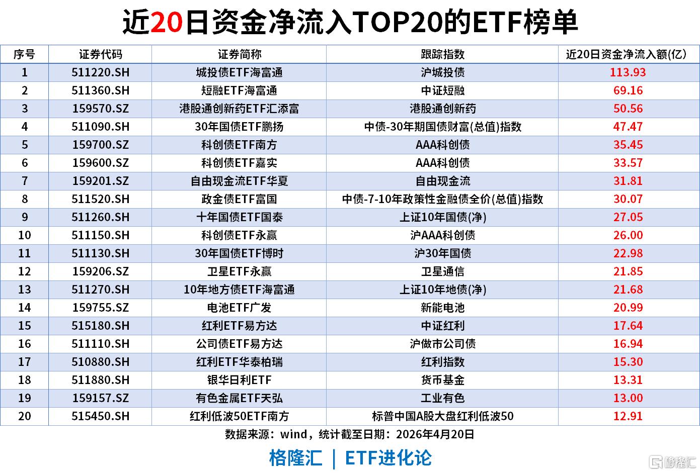 城投债ETF海富通以113.93亿净流入登顶,港股通创新药ETF汇添富以50.56亿净流入位列第三,成为成长赛道中最受资金青睐的方向;,红利、自由现金流等稳健资产同步获配置,资金主线清晰聚焦固收、医药与高景气成长赛道,兼顾底仓安全与成长弹性。