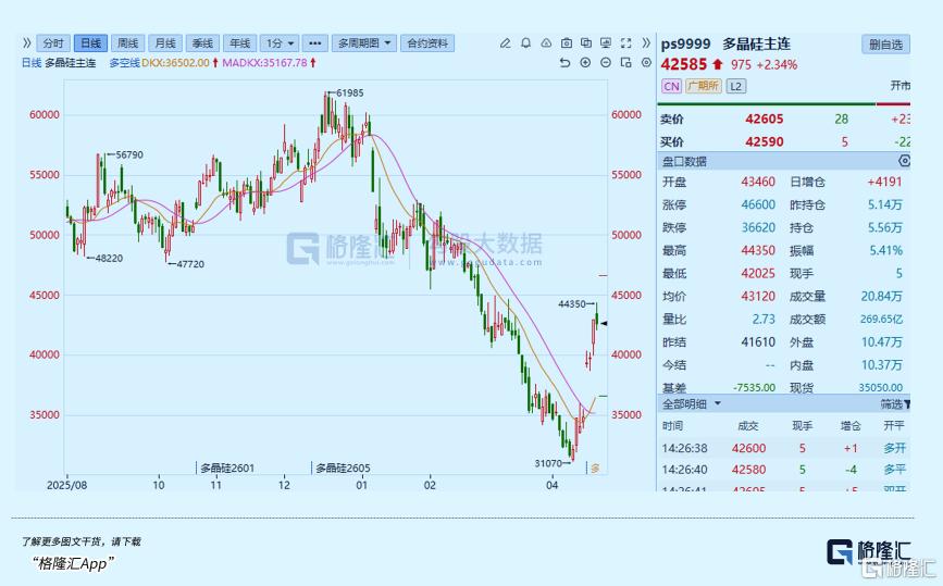 就在上周,市场多次传出有关多晶硅“控产挺价”的小作文,持续刺激资金入场炒作。多晶硅期货主力合约也从4月10日3.1万元/吨的阶段性低点,一路猛涨至超4.4万元/吨,短短几个交易日涨幅超45%。