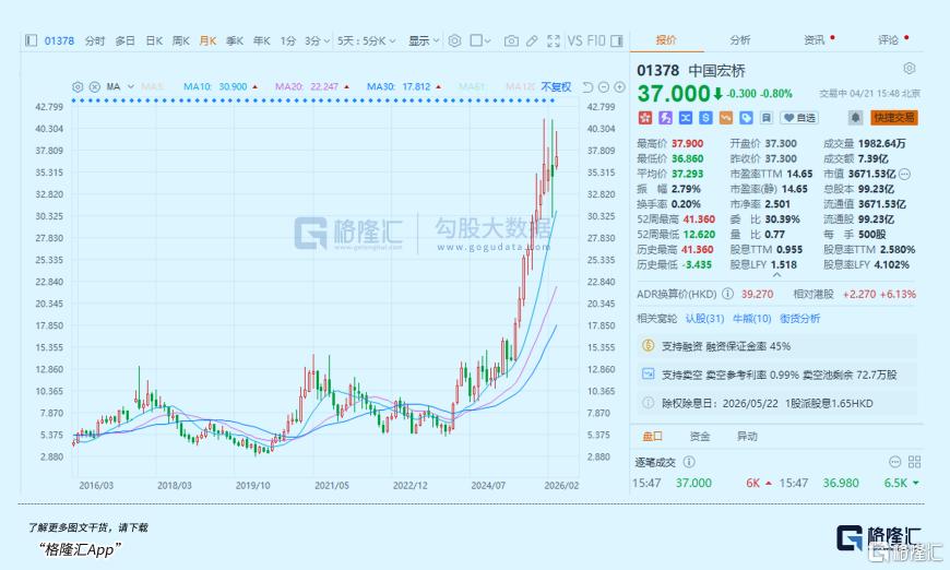 还有全球最大电解铝民营企业巨头,在港股上市的中国宏桥,其股价从2020年底部以来累计涨幅甚至高达10倍(前复权)。