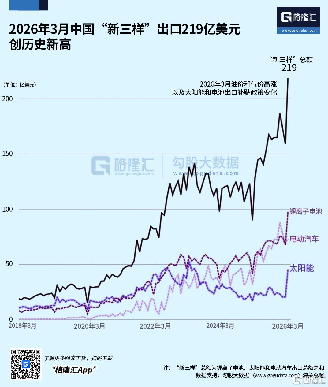 现在储能早已不是单纯新能源逻辑,叠加AI算力用电刚需+能源自主安全双重主线,叙事全面升级,宁德时代26Q1业绩也是一锤定音,2026年3月中国“新三样”出口219亿美元创历史新高再次验证新能源领域的中国绝对优势。